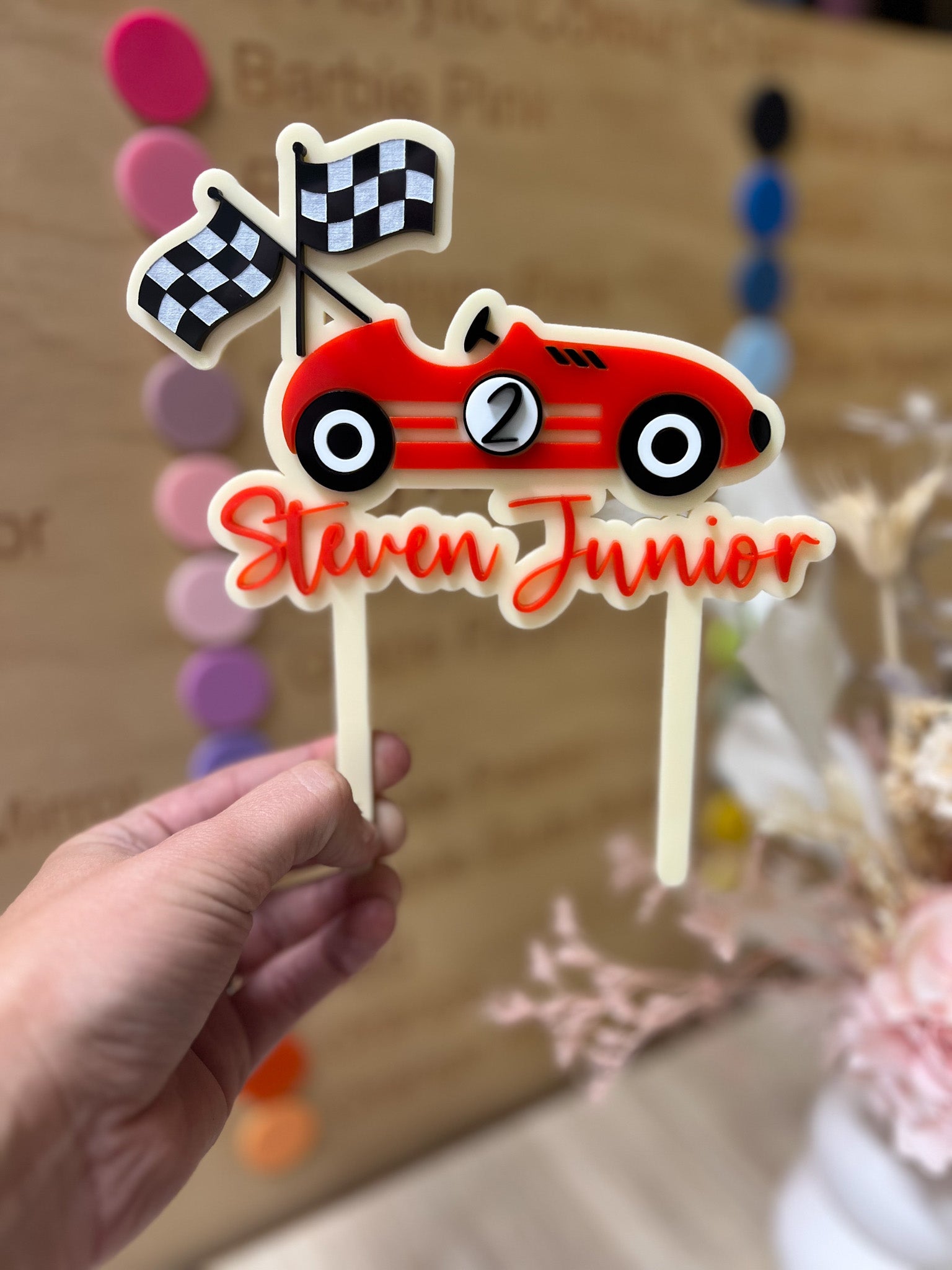 This race car acrylic cake topper is carefully made and perfect for your next cake! It comes in a wide range of colours to suit any theme. You also have the option to add a second topper with a number to match the celebration.