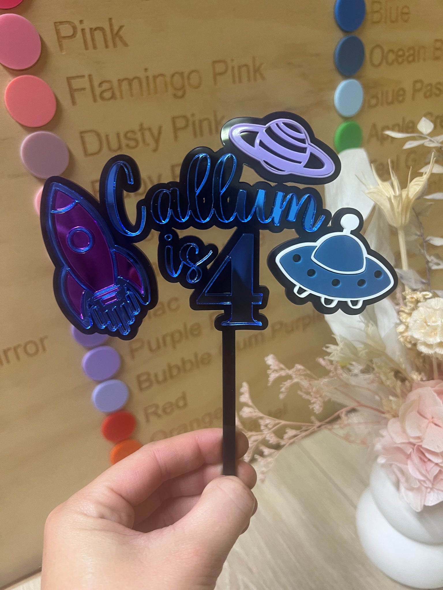 Blast off into birthday fun with this space-themed cake topper, the perfect finishing touch for your celebration! Featuring unique space elements and fully customisable with your chosen acrylic colours, it's sure to be a showstopper on any cake.